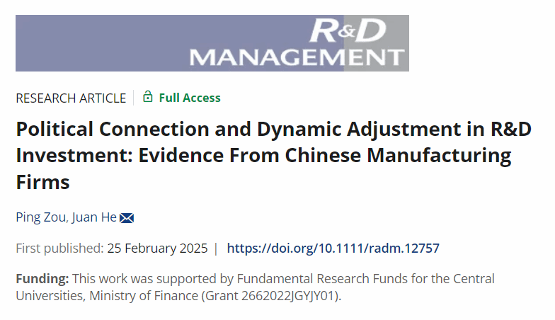 beat365官网会计系邹萍副教授和经济学系贺娟副教授近期在“R&D Management”合作发表论文“Political Connection and Dynamic Adjustment in R&D Investment: Evidence From Chinese Manufacturing Firms”。“R&D Management”属于JCR社科类一区SSCI期刊,五年影响因子7.1,ABS 3星期刊。该研究受到beat365官网自主科技创新基金(项目号:2662022JGYJY01)资助。邹萍为第一作者,贺娟为通讯作者。