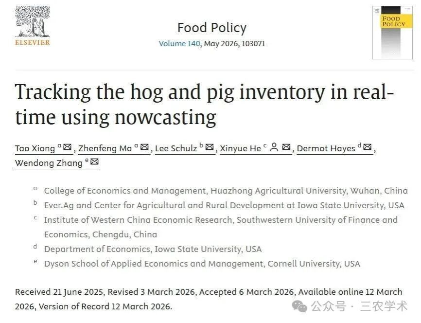 Tao Xiong, Zhenfeng Ma, Lee Schulz, Xinyue He*, Dermot Hayes, Wendong Zhang, Tracking the hog and pig inventory in real-time using nowcasting, Food Policy,2026, 140, 103071