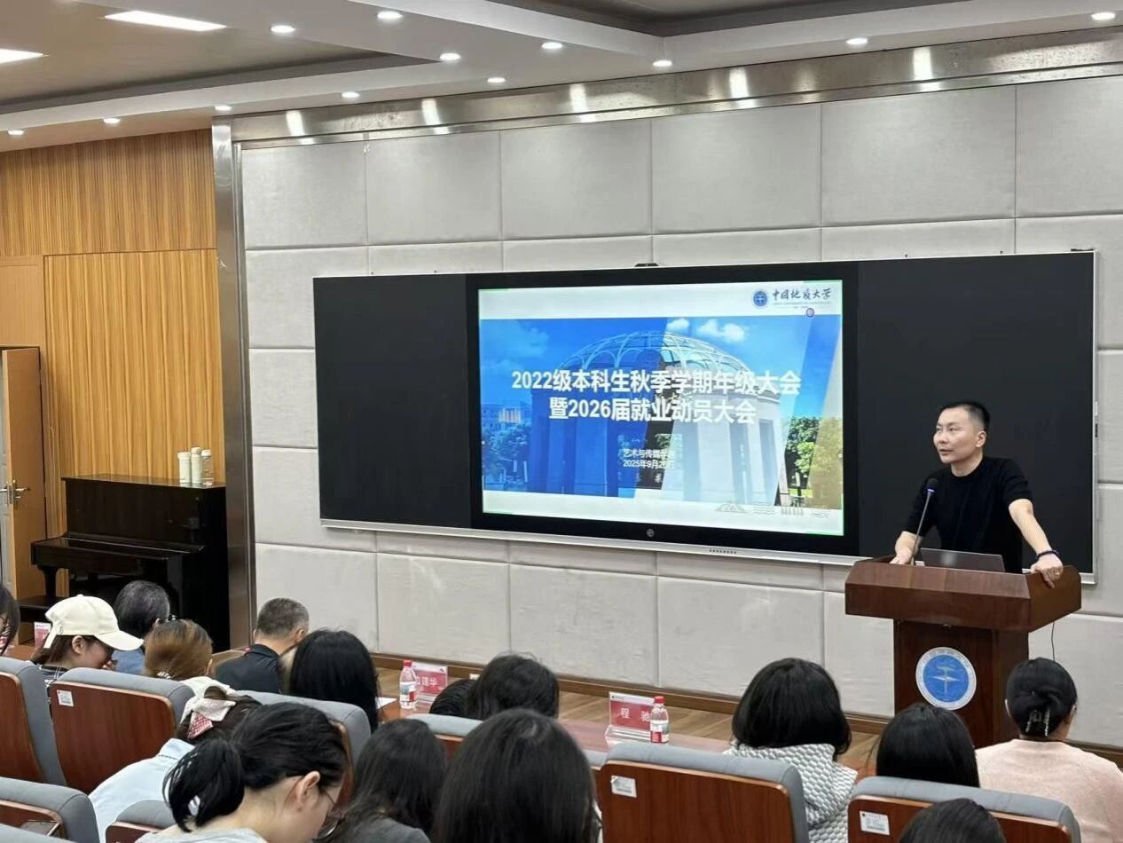 9月26日上午,Beat365正版唯一官网必一2022级年级大会暨就业动员大会在艺媒楼1114报告厅举行。院长何清俊,党委副书记边建华,视觉与媒体设计系系主任狄丞,环境设计系系主任李待宾,环境设计系系副主任程驰,音乐系系副主任杨青,新闻传播系专业教师、2026届毕业班班主任李静,学工组专职辅导员曾戈晖,兼职辅导员黄灿以及2022级全体学生参加本次大会。此次年级大会由辅导员曾戈晖主持,聚焦2022级本科生关切的最新考研政策、毕业发展规划指导两大核心议题,为同学们搭建起清晰的成长指引平台。