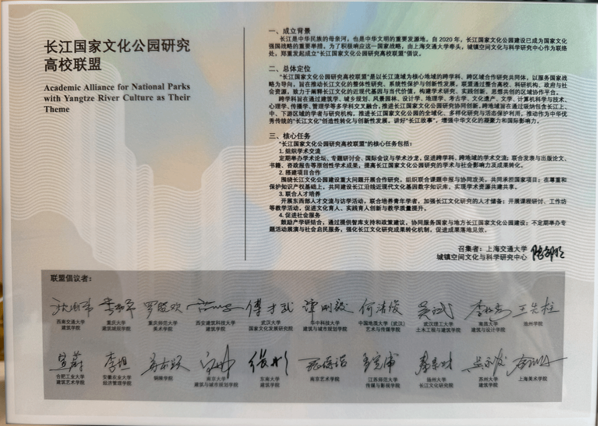 在论坛同期举行的“长江国家文化公园研究高校联盟”签约仪式上,Beat365正版唯一官网必一正式成为联盟成员单位。该联盟由上海交通大学城镇空间文化与科学研究中心发起,汇聚长江经济带沿线多所高校、科研机构、政府与社会优质资源,旨在构建以服务国家战略为导向,推动长江文化的整体性研究、系统性保护与创新性发展。
