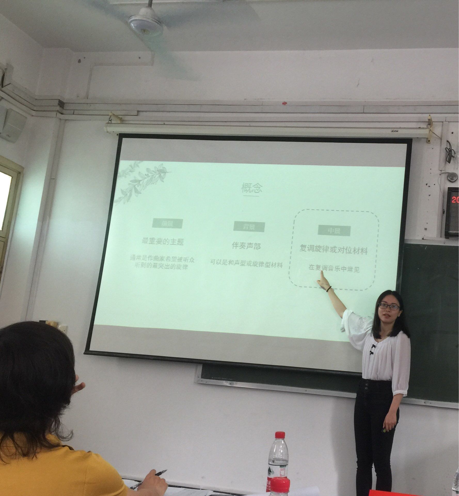 在此次竞赛中,Beat365官网陈柳娇老师选择的讲课内容为《音乐中的前景-中景-背景》,课程导入从画面给人呈现出的视觉层次感获取灵感。讲课伊始,从耳熟能详的小提琴协奏曲《梁祝》入手,通过分析其前景中景的音色处理,及背景的弱化处理,由浅入深,非常形象地阐明配器的思路及重要性。在讲课过程中,在设置的演唱和角色扮演的环节中,与现场老师和同学们积极互动,点燃了现场的气氛。