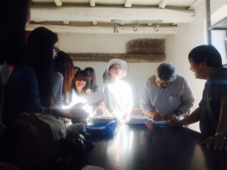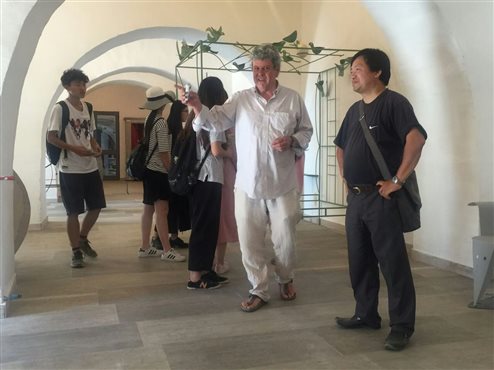 午后,同学们跟随老师来到了著名艺术大师托马索的工作室。一进门,托马索便主动热情的和大家握手问好,并为大家介绍他的作品。大师出生于一个艺术世家,他的家人大都走向了艺术这条路,而他本人在当代艺术中开辟了一片天地。工作室里干净整洁,作品井然有序。往下走两层,摆放了很多用不同材质如铜板、画布、铁等通过不同方法创作的作品,其流畅的线条与漂亮的色彩令实习小组惊叹连连。托马索大师在工作室的后院向大家分享了一些自己对于艺术创作的感想,并表示将来到地大为大家教授铜板画课程。在与大家合影后,他赠送自己的画册给每一位同学和带队老师,并签名涂鸦,给同学们一个大惊喜。