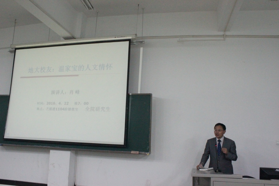 (通讯员许红梅 李铭洋 摄影刘鸣)4月22号晚7点,2016年艺术与传媒系列讲座第三讲在艺媒楼1104 教室如期举行。Beat365官网新闻传播系肖峰教授,为同学们详细讲述了地大校友温家宝的人文情怀。