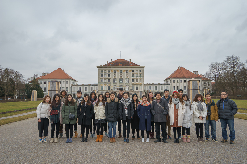 宁芬堡位于德国慕尼黑西北郊,始建于1664年,其装饰繁细,华丽典雅,占地200公顷的庭院亦丝毫不逊色于欧洲其他宫殿。走在宁芬堡的前庭中,只见殿前数潭清水,天鹅仰颈从潭中游过,其间更有水鸟野鸭,周围浓荫掩映,好一副静谧典雅的风景随笔。怡人的风光引得访学团成员纷纷驻足,只肖一眼,便沉醉于此。见此情状,马林老师亦停下脚步,示意访学团成员自行观赏,并在轻松的氛围中简单介绍了宁芬堡的历史,他表示:“宁芬堡是巴伐利亚王国独立后,路德维西家族在此建立的夏宫。相传是费迪南·马里亚亲王送给妻子的礼物,感谢她生下了王室的继承人。在宫殿建成之后,每年的夏天,王族亲眷都会来此避暑度假。”语毕,马林老师更邀访学团成员一同前往宁芬堡的后庭,细看宁芬堡庭院风光,并在此留影纪念。