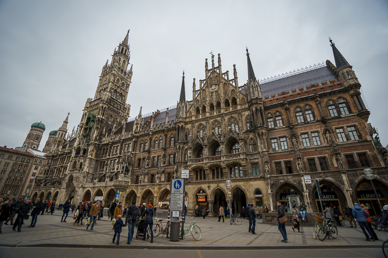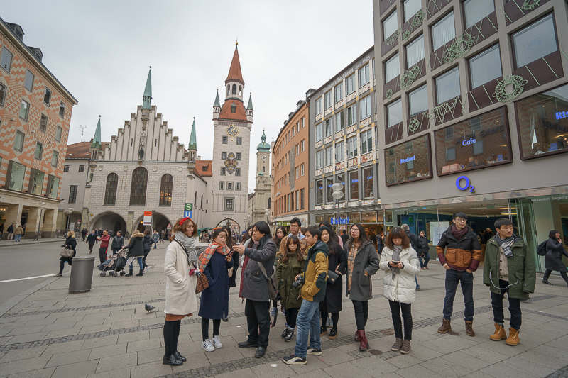 玛利亚广场是慕尼黑的市中心广场。广场中部立着圣母玛利亚的塑像,北面则是慕尼黑市政厅。站在广场的中心,马林老师向访学团讲述了广场上玛利亚塑像的由来,更手指着市政厅中间的钟楼,示意访学团细细观赏,并表示:“在市政厅中间的钟楼上有着著名的玩偶报时钟,在每日的上午11点与下午5点,报时钟内的玩偶便伴随着音乐而出,展现1568年威廉五世大婚与消灭黑死病的场景。而在广场的西北面,则是著名的洋葱顶圣母教堂,它造型独特,是慕尼黑的象征。”