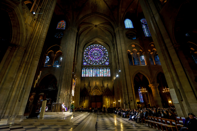 随后,马林老师带领访学团进入教堂内部进行参观。今年正值圣年,教堂内正举行隆重的受洗仪式,以响应梵蒂冈的祭拜盛典,巴黎圣母院大教堂的主教亦在其中。访学团成员均对此产生了浓厚的兴趣,纷纷拿出相机,记录下这一神圣时刻。对此,马林老师表示:“圣年对于教徒来说是有着重大意义的一年,且巴黎圣母院的主教地位很高,可与米兰教堂、科隆教堂主教并肩,而主教的出现也足可见天主教对圣年的重视。”而关于教堂的设计,马老师则认为,巴黎圣母院的结构关系与米兰大教堂是一致的,总体呈十字交叉式,亦同样具有‘高’、‘棱’、‘空’的特点,但总体设计却不尽相同。与米兰大教堂相比,巴黎圣母院既保留了哥特式建筑的特征,亦在其中融入了新的元素,使得其建筑形式富有变化,十分独特。说罢,便引导访学团在教堂内继续观赏。