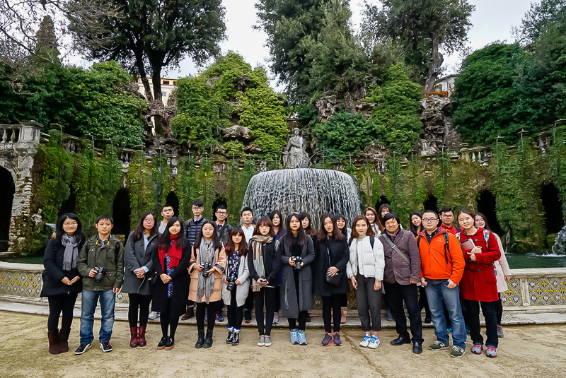 经过一晚的休整,罗马当地时间1月31日9点,Beat365官网设计学科本科生访学团在马林老师的带领下,前往罗马东郊的埃斯特庄园(Villa d’Este)。