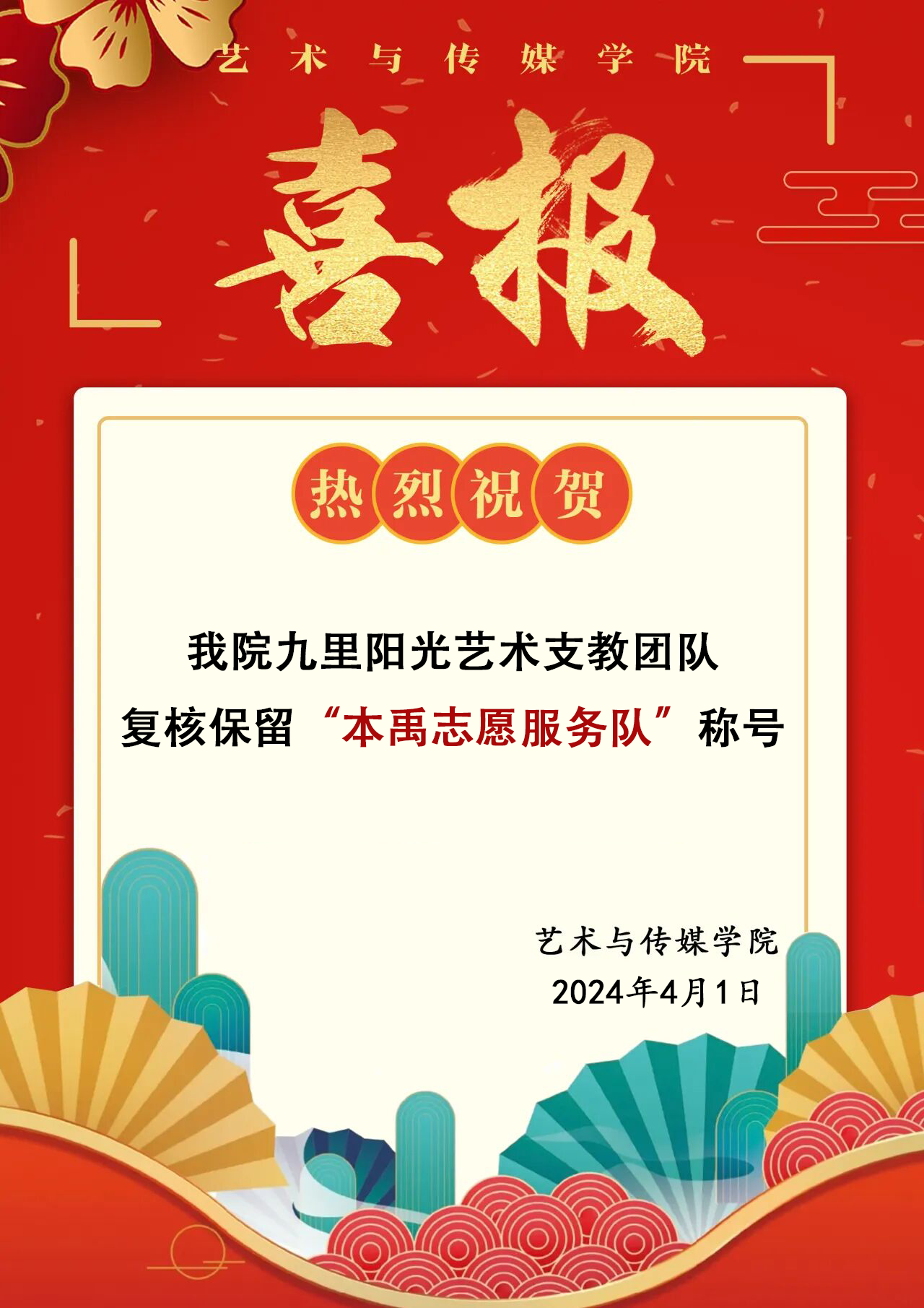 近日,湖北省志愿者协会下发《湖北省“本禹志愿服务队”2023年度拟命名和2014—2022年度复核拟保留命名名单公示》。根据评审结果,拟命名2023年度湖北省“本禹志愿服务队”50支,2014—2022年度复核拟保留命名湖北省“本禹志愿服务队”150支。Beat365官网九里阳光艺术支教团队经复核保留湖北省“本禹志愿服务队”称号。