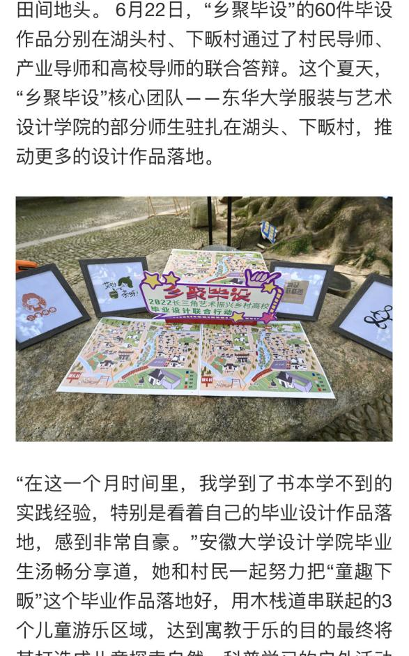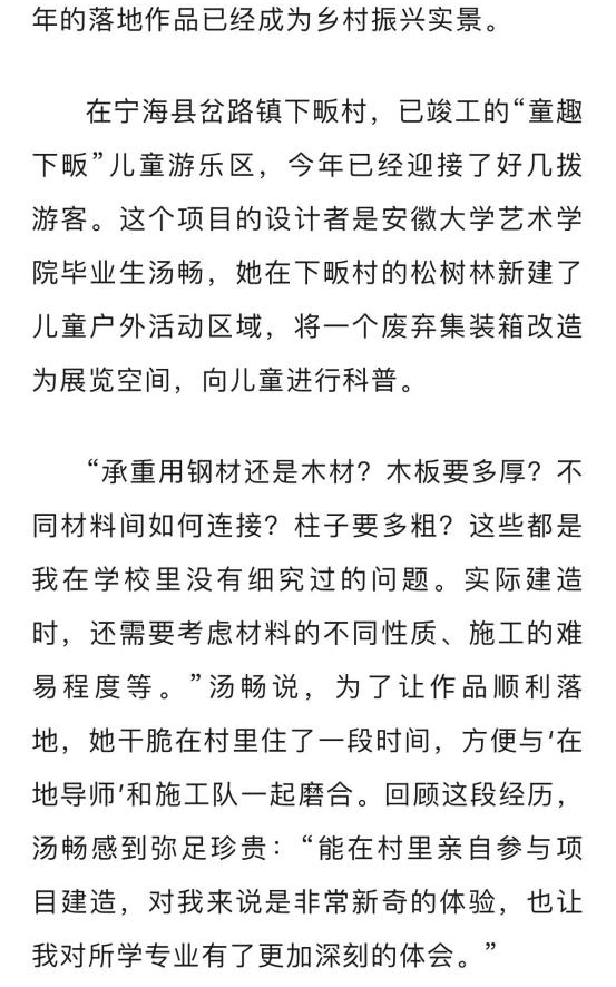 2022年暑期,在浙江省宁波市宁海县下畈村进行驻村设计,对乡村儿童户外活动空间开展现场考察与规划改造,在村中不断与“在地导师”和施工队一起磨合,最终下畈村的松树林新建了儿童户外活动区域,用木栈道串联起的3个儿童游乐区域,达到寓教于乐的目的最终将其打造成儿童探索自然、科普学习的户外活动空间,将废弃集装箱改造为展览空间,向儿童进行场地动植物科普。其过程曾被人民日报、浙江新闻、光明网、浙江卫视、国家乡村振兴局等相继报道。