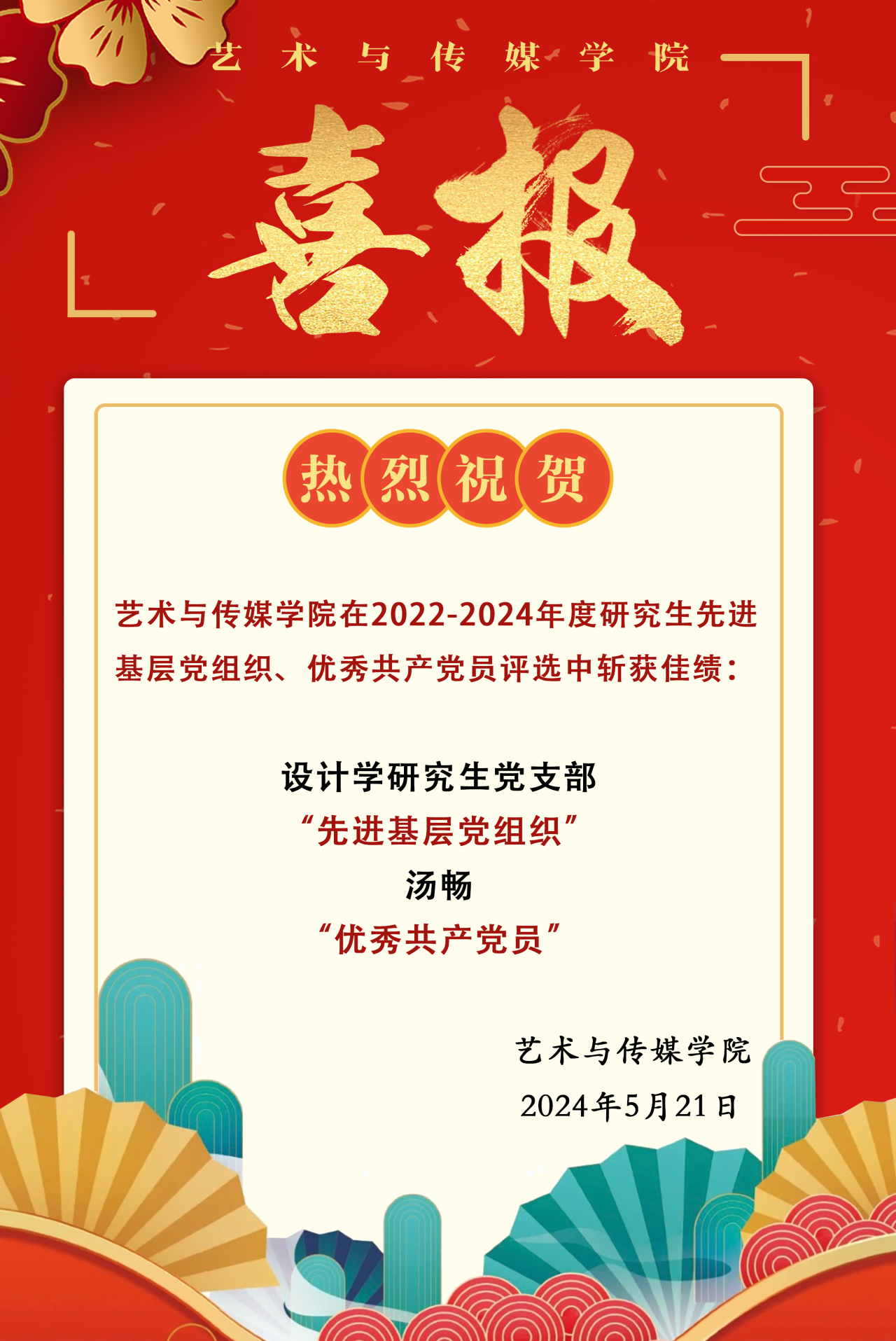 汤畅同志政治立场坚定,品行端正,拥护中国共产党领导,思想上始终与党中央保持高度一致。研究生阶段作为支部书记,完成国家教育行政学院“2023年学生党支部书记”专题培训,并多次组织支部党员参加红色活动,始终以饱满的工作热情,积极投身于支部党建工作当中去,坚决按照学校党委的要求,通过多种形式开展理论学习和实践活动,落实好组织生活,工作中坚持三会一课制度。时刻关注国家大事,认真学习马列主义、毛泽东思想、邓小平理论和三个代表重要思想,拥护和执行党的路线、方针、政策,坚持用科学的理论武装自己的头脑,在政治上始终同党中央保持一致。以“艺术赋能乡村设计”为题进行宣讲,结合党建与设计,向同学们分享设计助力乡村振兴的过程与方法,并获艺术党课结题答辩三等奖。