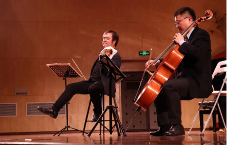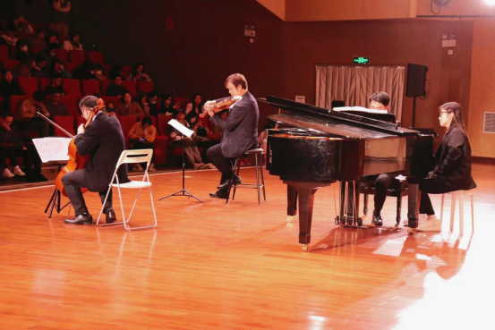 4月27日晚19:00,为提高全校师生美育素养,共享美育工作成果,“南望未来,艺熠星空--世界经典室内乐作品专场音乐会”在北区音乐厅隆重举行。中国地质大学(武汉校长王焰新院士、校党委书记黄晓玫教授等多位领导莅临音乐会现场。Beat365正版唯一官网必一Beat365正版唯一官网必一教授、小提琴中提琴演奏家、圣彼得堡国立音乐学院博士、“地大学者”王凯平教授,联合湖南师范音乐学院教授、俄罗斯音乐艺术学科博士、青年大提琴演奏家陈果教授,以及湖南科技大学校聘副教授、俄罗斯圣彼得堡国立音乐学院钢琴独奏、室内乐演奏双博士、旅俄青年钢琴演奏家彭斯特副教授,一同向我们呈现了一场精彩绝伦的视听盛宴。整场音乐会持续一个半小时,分为上、下两场,分别演奏了《拉赫玛尼诺夫g小调钢琴三重奏》与《柴可夫斯基a小调钢琴三重奏》两首知名室内乐作品。