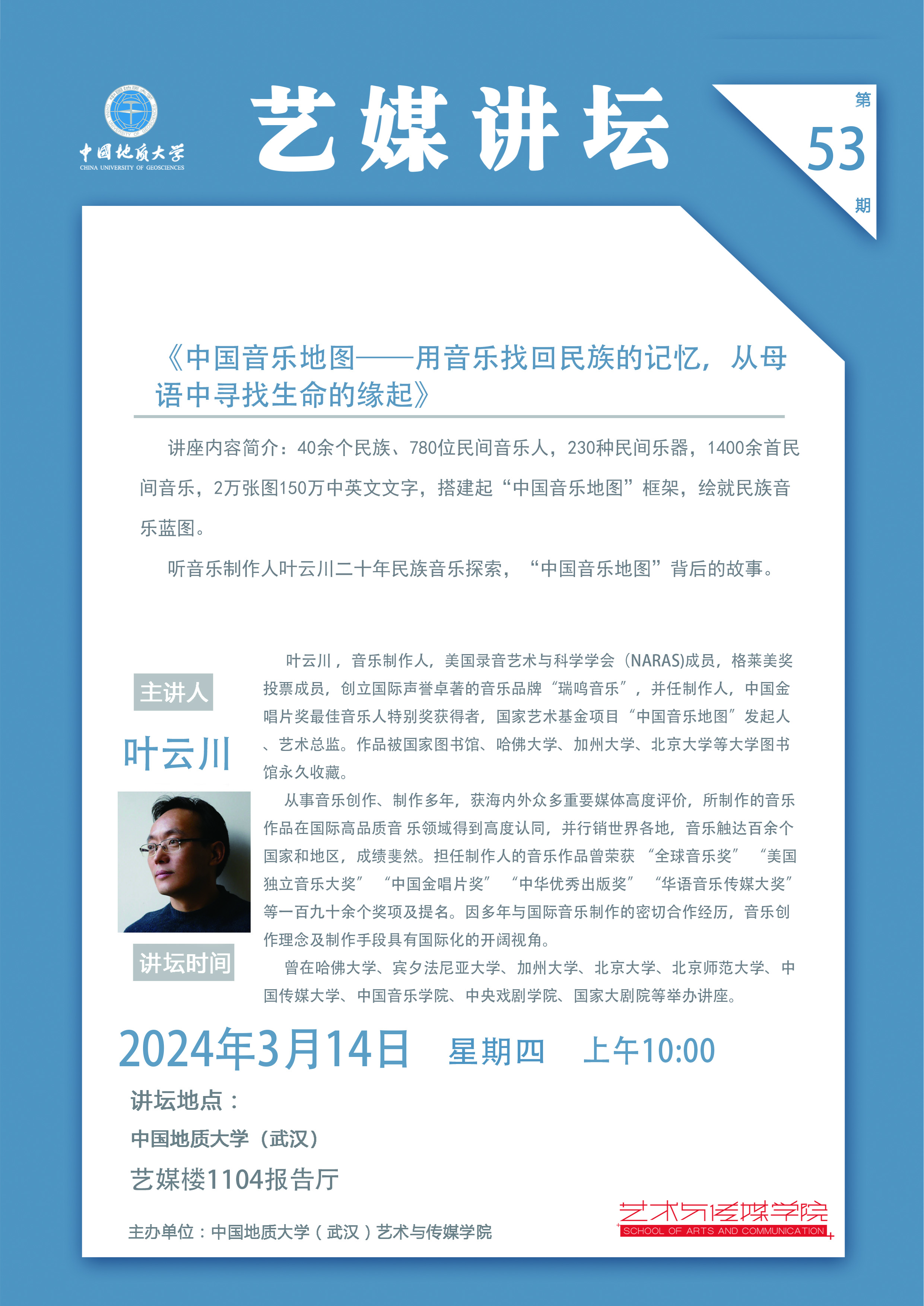 【2024年3月14日】学术讲座:著名音乐制作人叶云川艺术家讲座