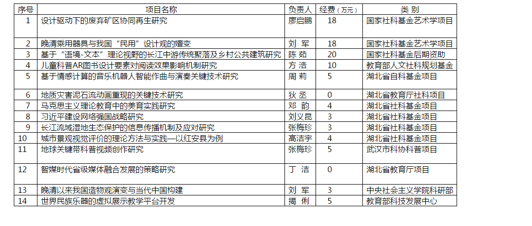Beat365官网一直重视科研实力的提升,在申报项目时通知动员及时到位,申报过程中跟踪服务到位,在制定学院绩效考核时强调以学术成果为导向的评价体系,经过全院教职工共同努力,今年在纵向科研项目获批的数量、级别和经费方面均实现历史突破,共获各类纵向项目14项,其中国家社科基金艺术学项目3项,教育部社科规划基金1项,国家其他部委项目2项,湖北省社科基金4项,湖北省自科基金1项,湖北省教育厅项目2项,武汉市科协项目1项 ,到位经费98万元。