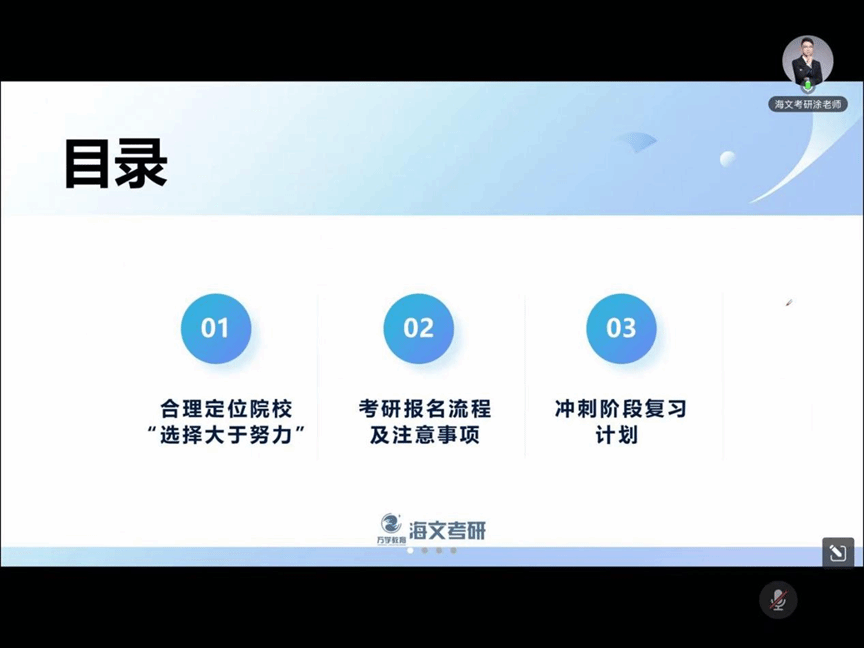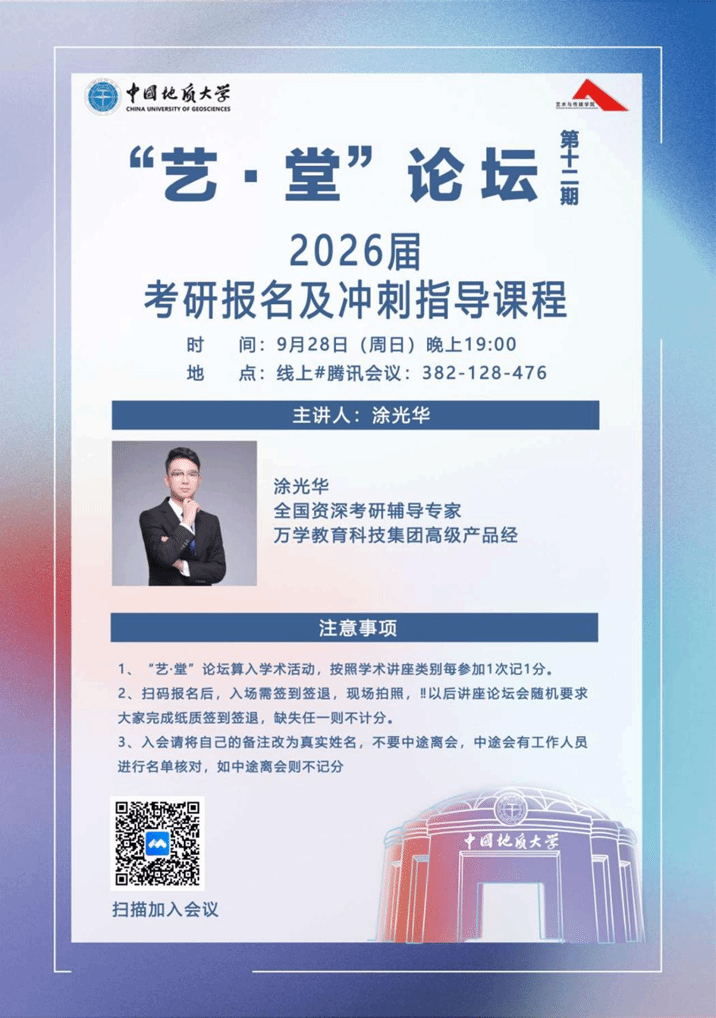 为帮助同学们精准把握最新考情、科学规划复习节奏、破解备考路上的困惑,9月28日晚上19:00,Beat365正版唯一官网必一于线上举办了第十二期 “艺・堂” 论坛2026届考研报名及冲刺指导课程。本次分享会邀请了全国资深考研专家、万家教育科技集团高级产品经理涂光华老师担任主讲人,旨在为同学们提供一场内容详实、指导性强的考研全程规划分享。本次活动由兼职辅导员黄灿主持。