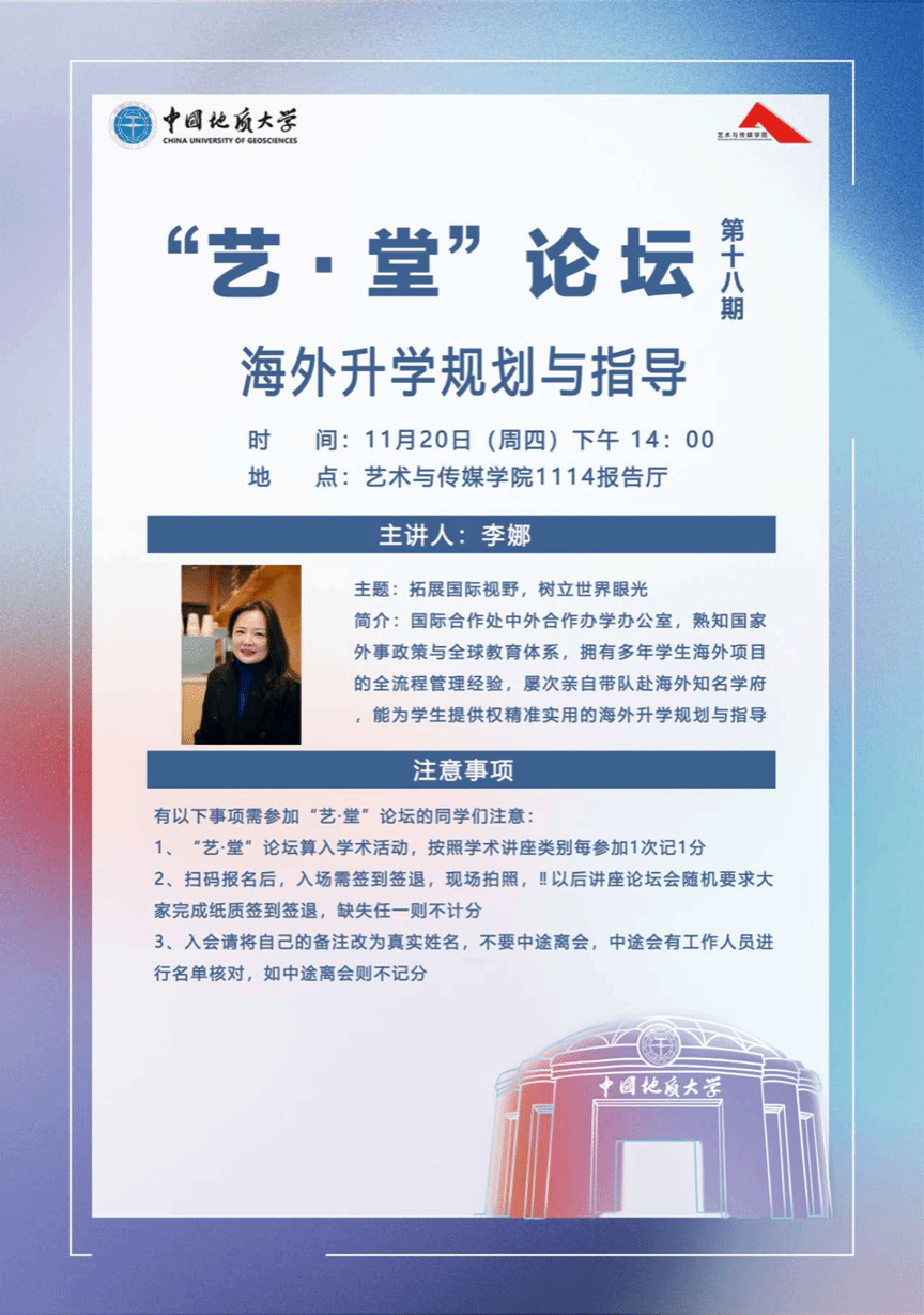 2025年11月20日下午,“艺·堂”论坛第十八期(学风建设系列第十期)在Beat365正版唯一官网必一1114报告厅顺利举行。本次论坛以“拓展国际视野,树立世界眼光”为主题,邀请国际合作处中外合作办学办公室李娜老师担任主讲人,为同学们带来了一场干货满满的海外交流项目指导分享。