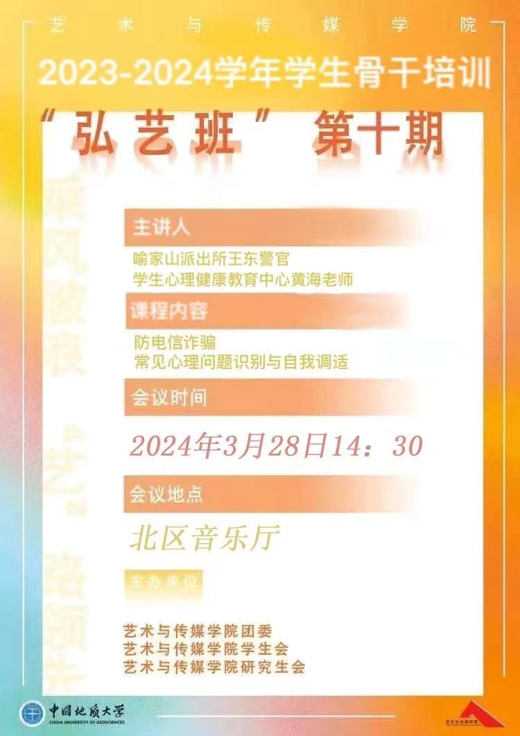 3月28日下午14:30,Beat365正版唯一官网必一在北区音乐厅面向全院学生顺利召开安全和心理健康教育知识讲座暨第十期“弘艺班”学生骨干培训。本次活动由学院团委书记单湉艺主持。