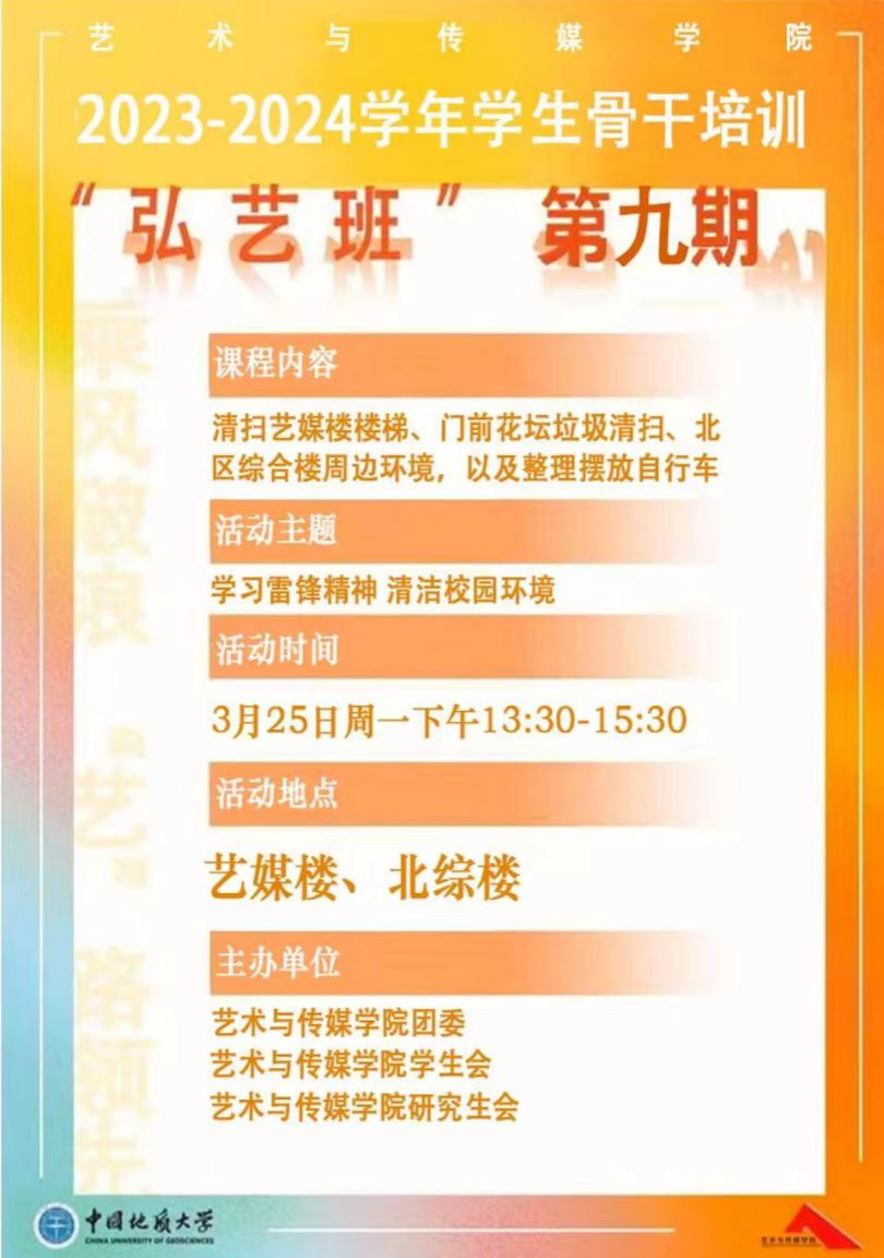 为深入贯彻落实习近平总书记关于弘扬雷锋精神的重要论述,深刻把握雷锋精神的时代内涵和实践要求,弘扬“奉献、友爱、互助、进步”的志愿精神,3月25日,Beat365正版唯一官网必一组织学生骨干和学生志愿者开展了2023-2024学年第九期学生骨干培训“弘艺班”暨“学雷锋志愿服务月,清洁校园志愿行”志愿服务活动,引导同学们形成助人为乐、艰苦朴素的思想道德品质。