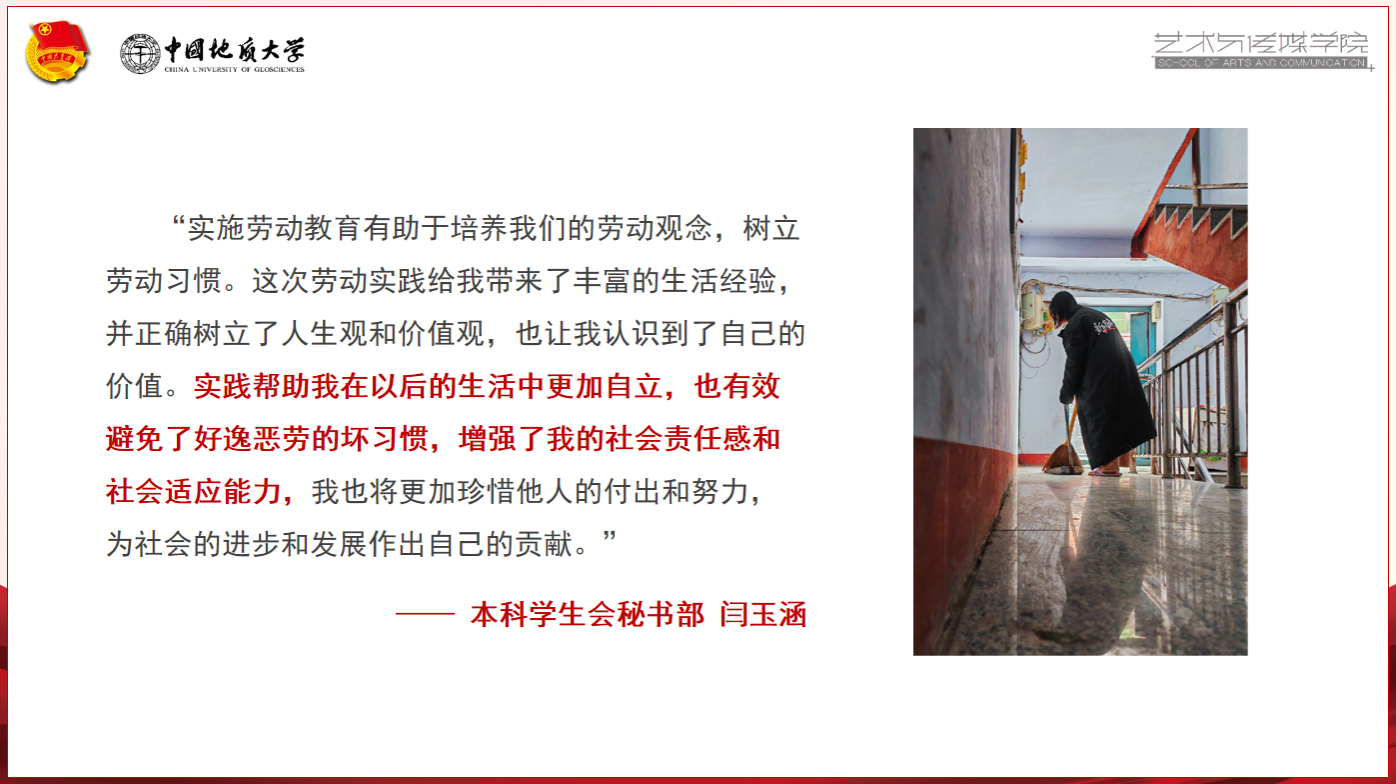 观看结束,王琦对学生会、研会成员寒假劳动教育实践优秀案例进行分享。通过展示Beat365官网学生干部假期社区志愿服务、家务劳动以及公益授课等具体的劳动实践,引导学生干部崇尚劳动尊重劳动、热爱劳动,以更好地精神面貌投入学习生活与工作。