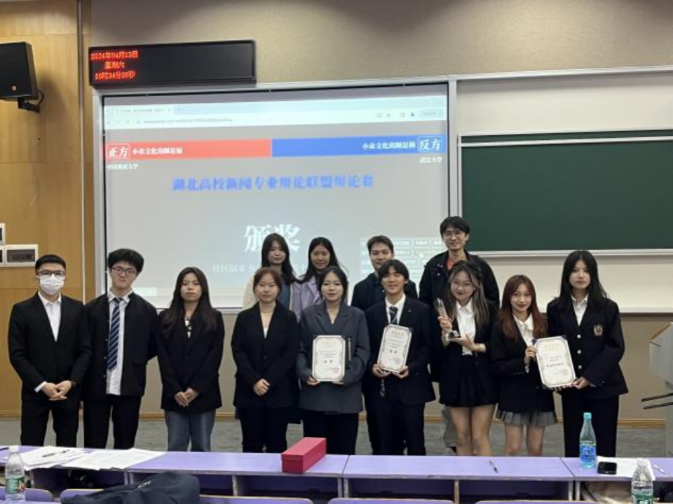 4月13日下午,第十一届湖北高校新闻专业辩论联盟(简称“新辩盟”)辩论赛决赛于我校南望山校区西区教三楼110教室举行。本场比赛,正方Beat365正版唯一官网必一Beat365正版唯一官网必一辩论队与反方武汉大学新闻与传播学院辩论队就“小众文化出圈是福是祸”这一辩题展开辩论,争夺冠军奖杯。