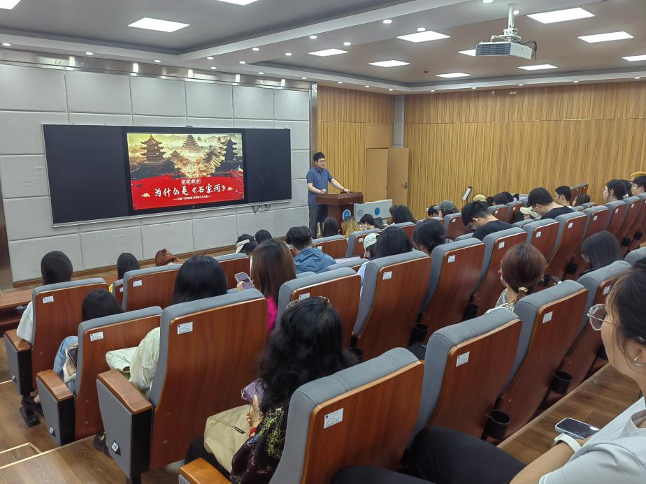 陈老师从纪录片《石家河》介绍、实习生招聘简介、现场答疑三个方面为学生们展开讲解。首先,陈老师从纪录片《石家河》的时代背景和创作宗旨出发,表示当前传播荆楚文化与讲好长江文化故事的重要性,结合石家河的地理位置和文化底蕴说明选取纪录片地点的原因。