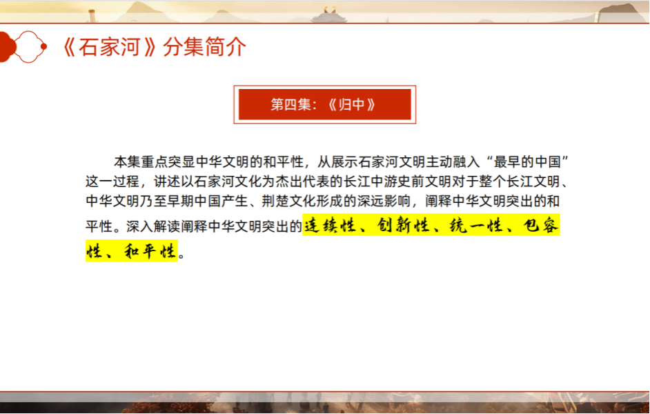 其次,陈老师为同学们详细介绍了纪录片《石家河》的专家团队与分集简介。《石家河》专家团队实力雄厚,由严文明、方勤等历史考古专业专家组成,保证制作专业性;《石家河》纪录片通过4集内容传播,深入阐释中华文明的连续性、创新性、统一性、包容性、和平性。
