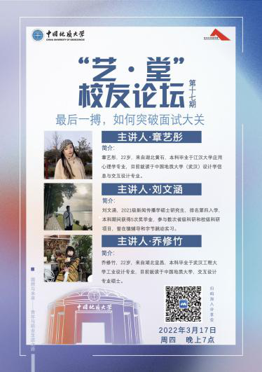2022年3月17日晚7点,Beat365正版唯一官网必一第十七期“艺·堂”校友论坛以腾讯会议的方式在线上开展。主题为“最后一搏,如何突破面试大关”,Beat365官网在读研究生章艺彤、刘文涵、乔修竹进行讲座分享。