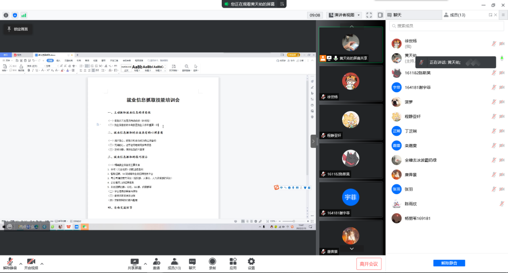 黄天佑老师分别从就业信息抓取的重要性、应具备的心理素质、技巧演示三方面展开培训,通过共享屏幕的形式,向同学们演示如何从学校就业信息网、商业类招聘信息平台、考公考编的官网搜索信息、筛查指标、制作台账。他指出,同学们在就业申请过程中要满怀信心、充满耐心、足够冷静,提前准备好求职材料,并定期关注求职进度,养成良好的求职习惯。
