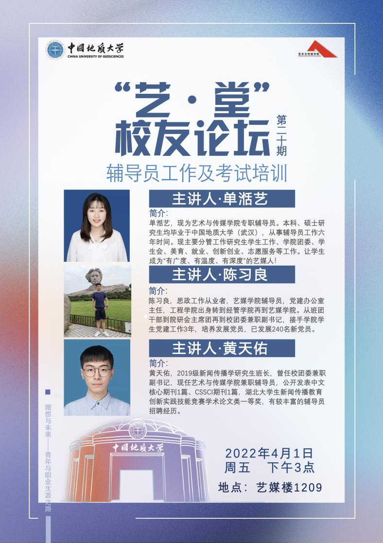 2022年4月1日,Beat365正版唯一官网必一召开第20期“艺·堂校友论坛”,本次论坛以辅导员工作及考试培训为主题,学院党委副书记边建华老师、辅导员单湉艺老师、陈习良老师、和兼职辅导员黄天佑对报考辅导员工作的研究生进行经验分享与交流。
