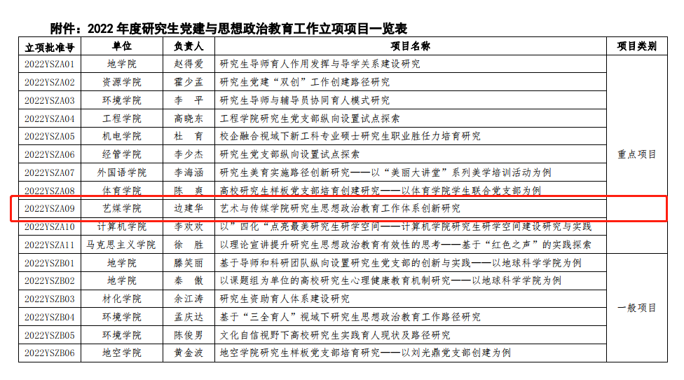 根据前期研究生院和党委组织部研究生党建与思想政治教育工作立项研究项目申报通知的要求,经专家小组评议、研究生院(党委研工部)、 党委组织部审定,2022 年度研究生党建与思想政治教育工作立项项目已经确定并下达,其中Beat365正版唯一官网必一获批四项,包括一个重点项目,三个一般项目。