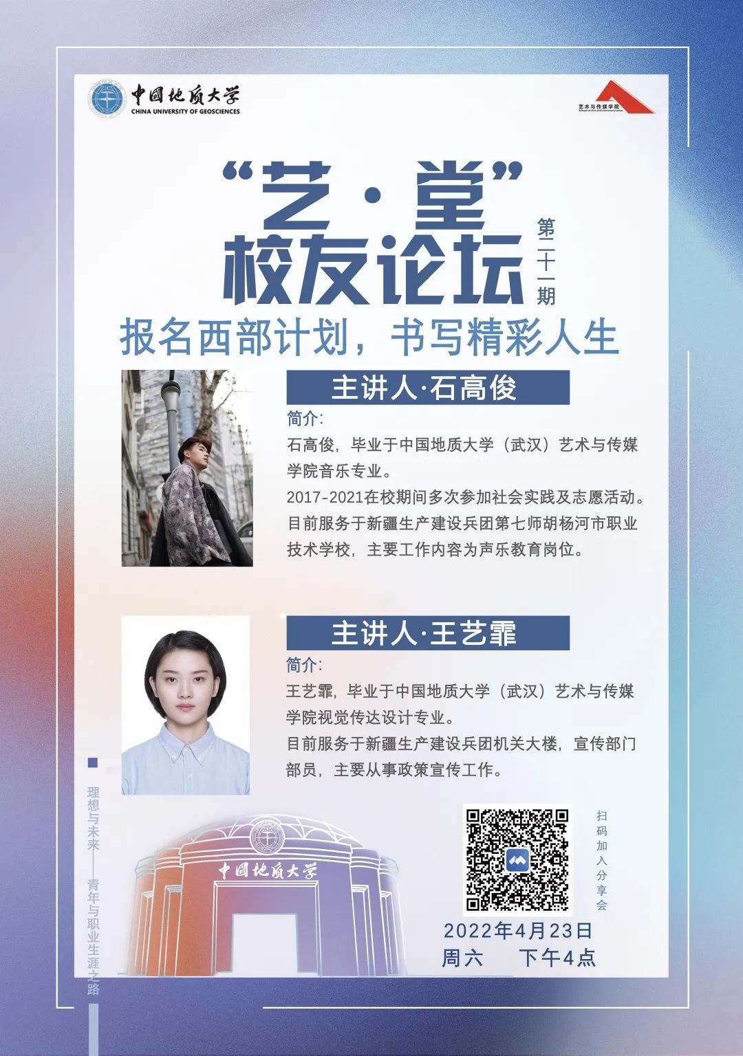 4月23日下午4:30,Beat365正版唯一官网必一第二十一期“艺·堂”校友论坛“报名西部计划,书写精彩人生”讲座活动顺利进行,由Beat365官网音乐专业毕业生石高俊和视觉传达设计专业毕业生王艺霏主讲。