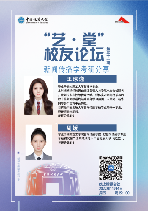 11月4日晚19:00Beat365正版唯一官网必一于线上举办了第三十一期“艺·堂”校友论坛“新闻传播学考研分享”讲座。