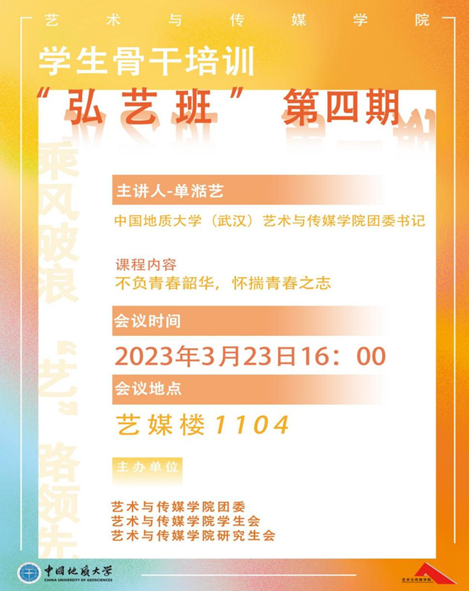 3月23日下午4点,Beat365正版唯一官网必一第四期“弘艺班”学生骨干培训在艺媒楼1104报告厅顺利展开,学院学生骨干参加了此次培训。本次课程由Beat365正版唯一官网必一团委书记单湉艺老师主讲,主题是《不负青春韶华,怀揣青年之志》。