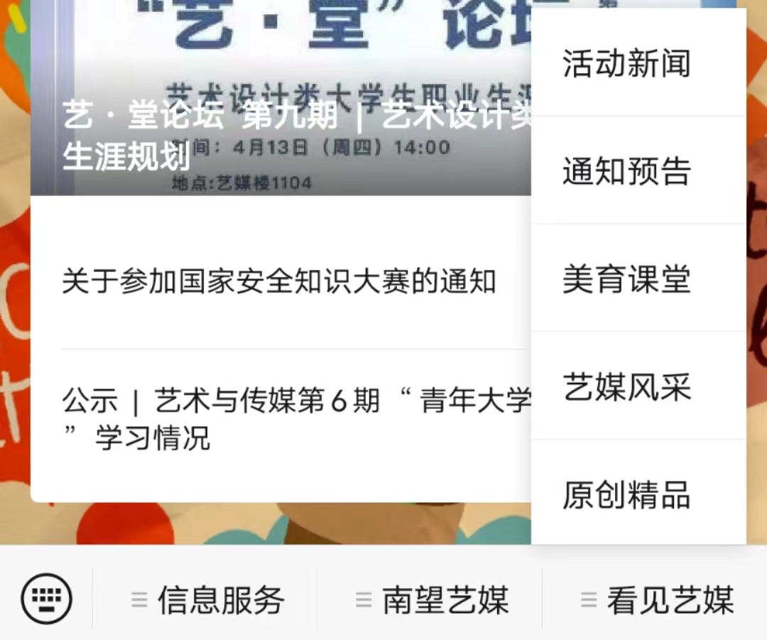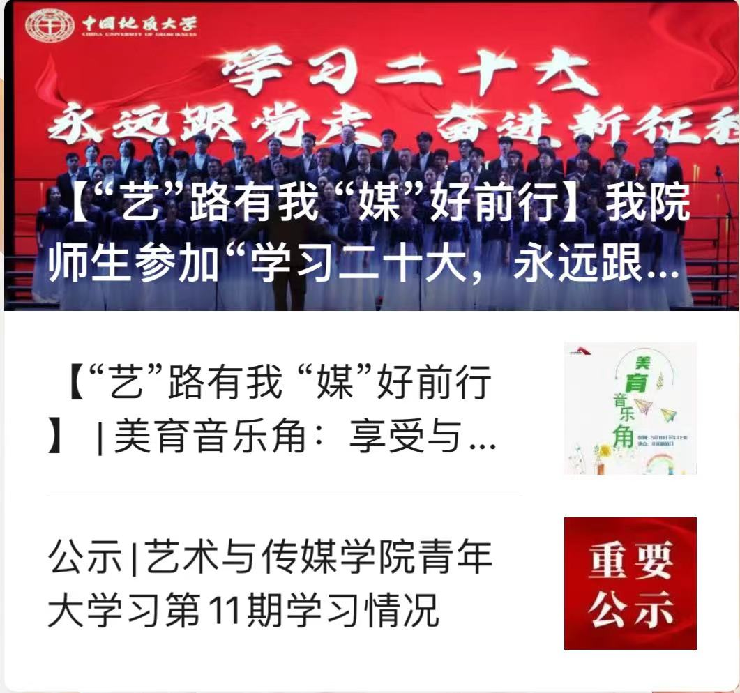微信公众号“CUG艺媒人”致力于丰富同学们的课余生活,做好各项通知、要闻的二传手,帮助同学们了解学院最新动向以及和自身发展、生活有关的各项事宜。因2021年疫情影响,Beat365官网许多活动搁置,但在2022年重新恢复了生机,全媒体中心将每一场会议、讲座的精华、重要内容整理成文稿的形式在CUG 艺媒人公众号上发布,供大家快速了解。
