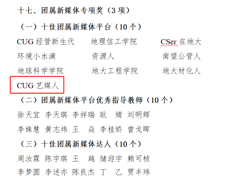 在学校近期“五四评优”活动中,Beat365官网官方微信公众号“CUG艺媒人”以特色鲜明的版式设计、持续性的优质内容输出、准确的角色定位等荣获“十佳团属新媒体平台”、全媒体中心王越荣获“十佳团属新媒体达人”、曾戈晖荣获“团属新媒体平台优秀指导教师”。