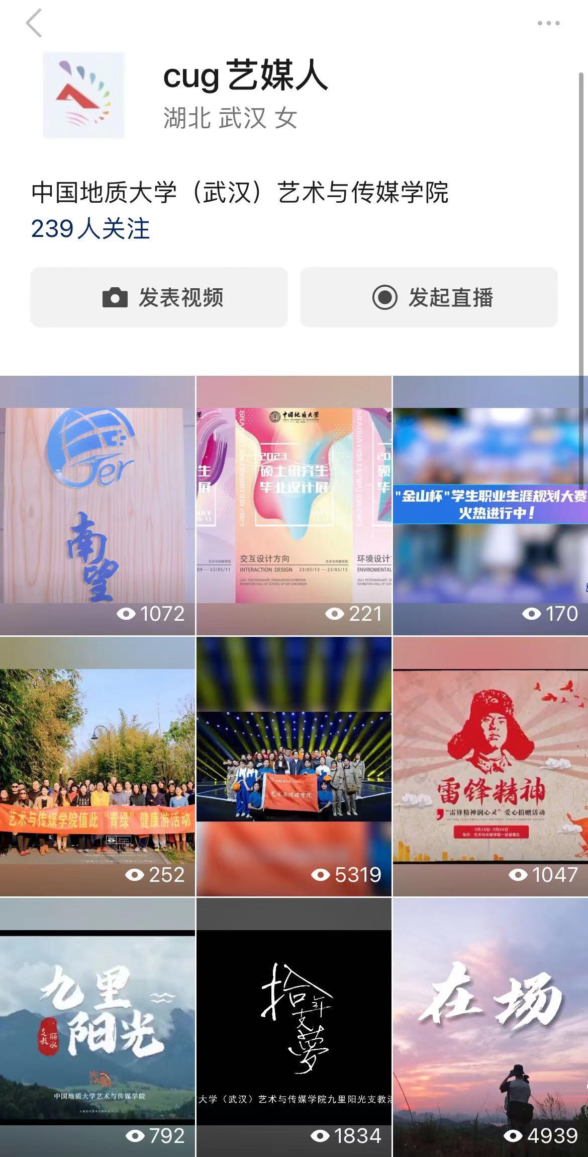 新媒体时代,CUG艺媒人不再只运营公众号,去年开设的视频号的“cug艺媒人”,在经过一年的精心运营下共发布原创视频39个,总播放量为38977,在当下短视频流行的年代,创新和丰富了新媒体作品的表现方式,记录艺媒人的点滴生活,留存珍贵回忆。如:《拾年 支梦》Beat365正版唯一官网必一Beat365正版唯一官网必一九里阳光支教活动纪录片、《万疆》、我们的军训时光Vlog,视频数据量均在5000+,学院师生频频点赞互动。