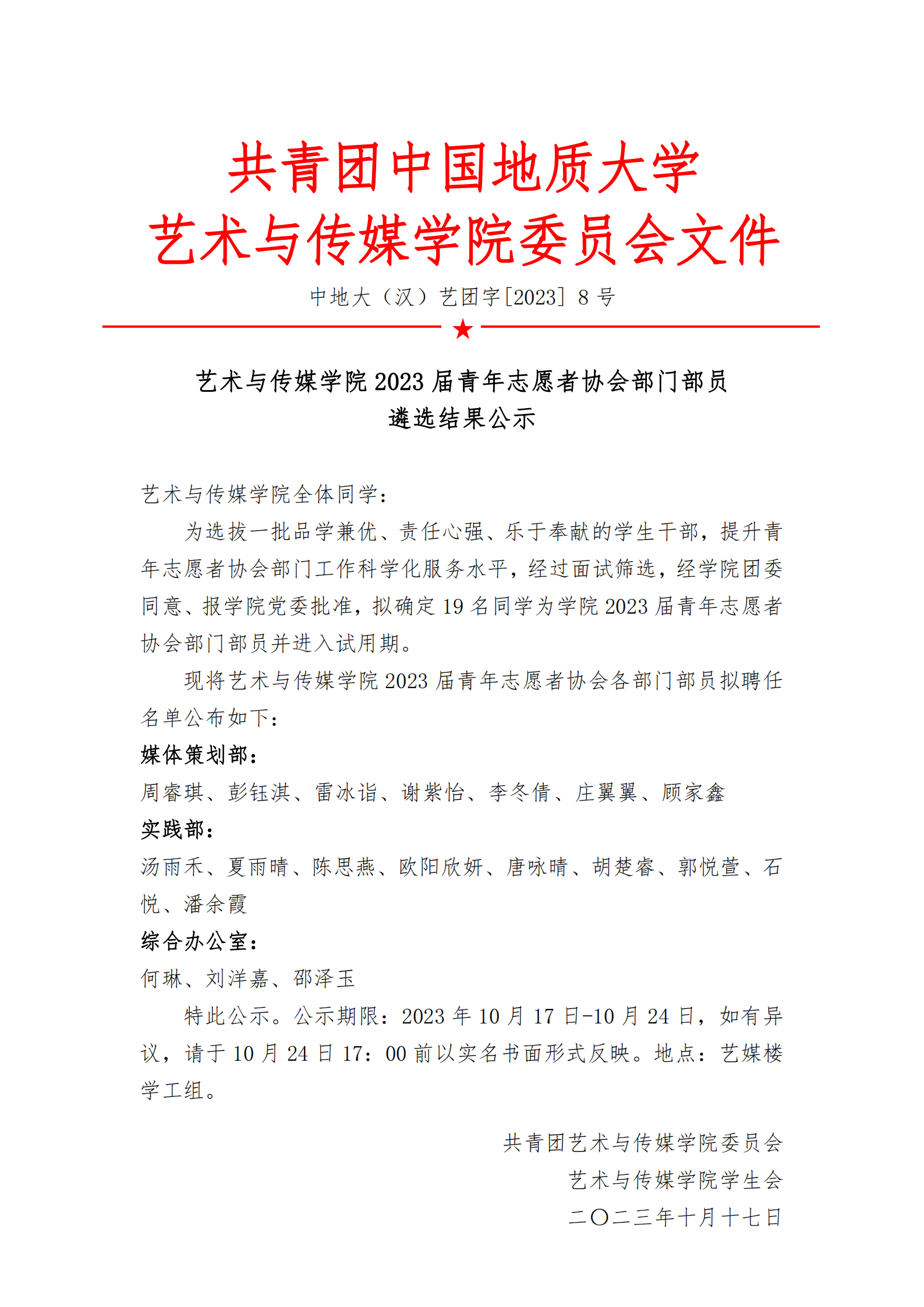 通知 | Beat365正版唯一官网必一2023届青年志愿者协会部门部员遴选结果公示