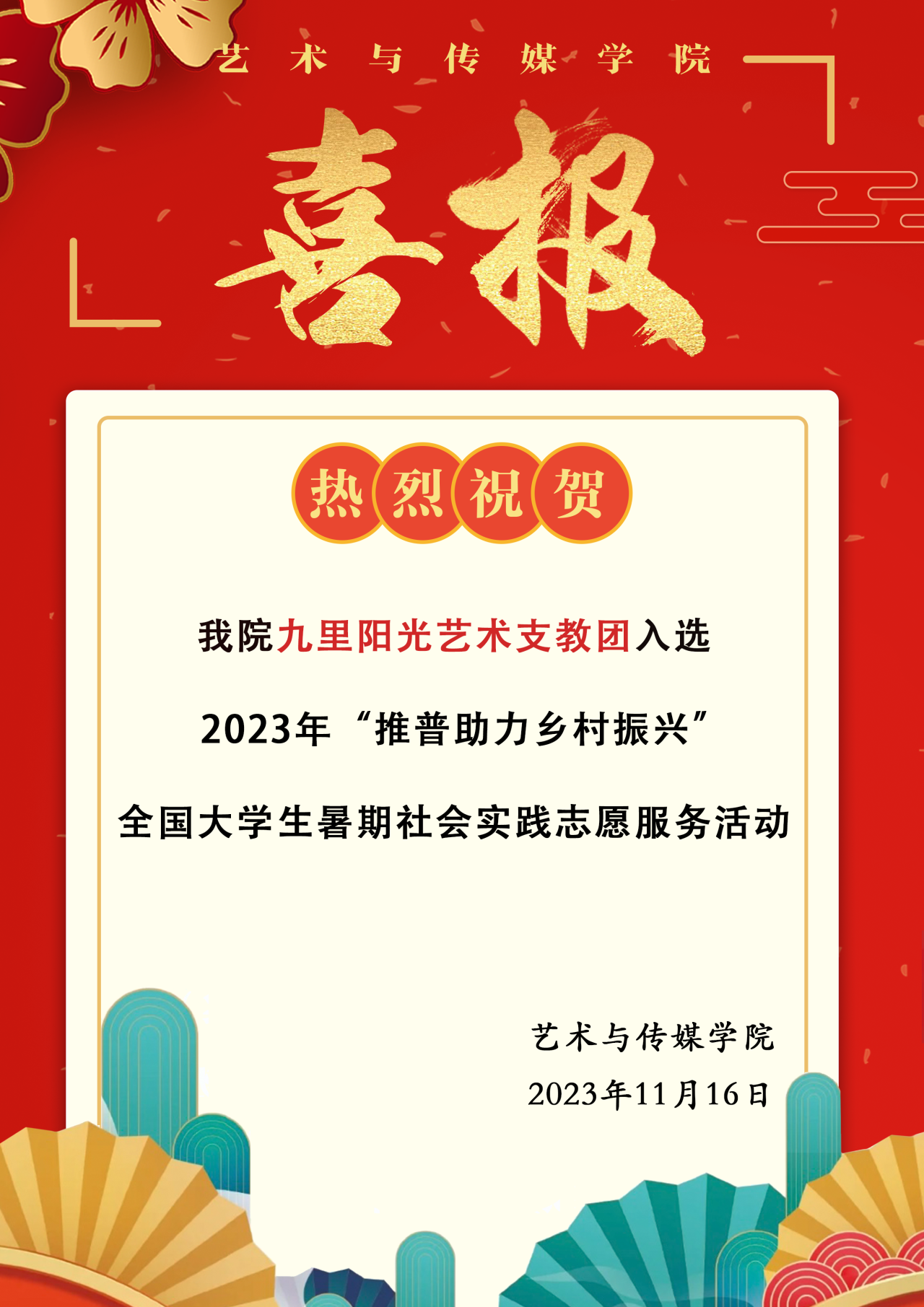 喜报|热烈祝贺Beat365官网九里阳光艺术支教团入选2023年“推普助力乡村振兴”全国大学生暑期社会实践志愿服务活动