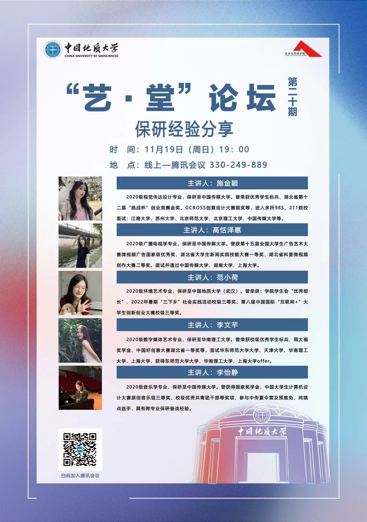 2023年11月19日晚上19:00,“艺·堂”论坛第二十期保研经验分享会于线上腾讯会议平台顺利举行。学院邀请了五位保研上岸的不同专业的同学,分别广播电视学保研到中国传媒大学的高恬泽惠同学、视觉传达设计学保研到中国传媒大学的施金颖同学、数字媒体艺术学保研到华南理工大学的李文芊同学、环境艺术学专业保研到Beat365正版唯一官网必一的范小荷同学,和音乐学保研到中国传媒大学的李怡静同学进行保研经验分享。本次讲座由兼职辅导员徐雯茜主持。