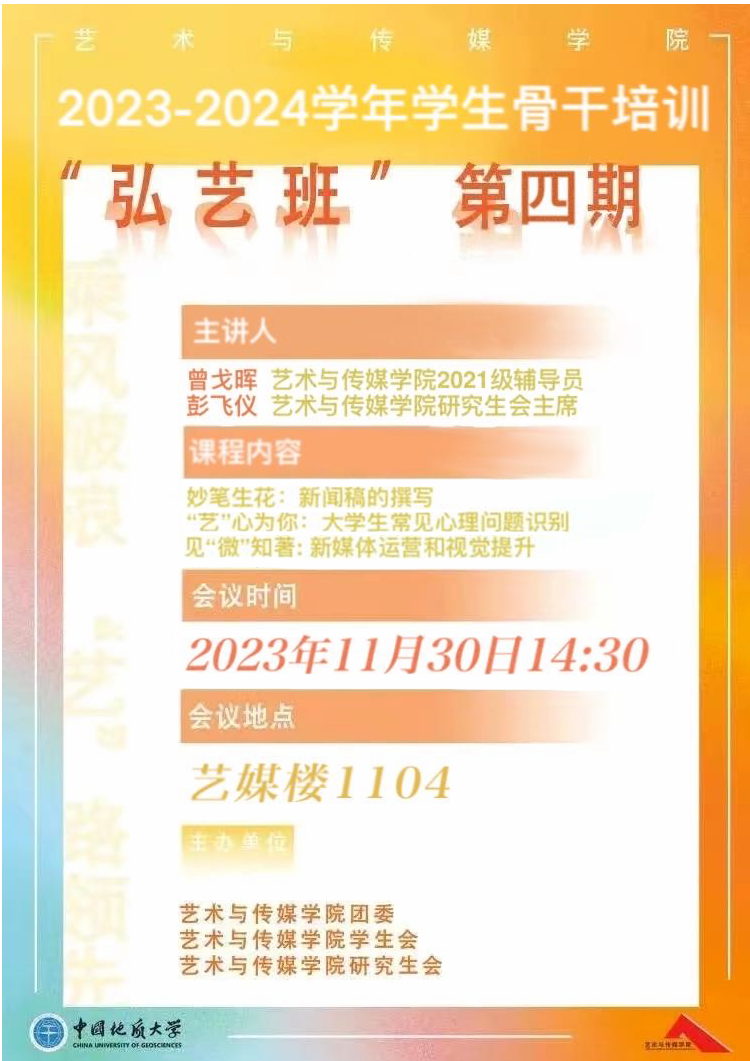 2023年11月30日14:30,Beat365正版唯一官网必一学生骨干培训“弘艺班”第四期于线上腾讯会议顺利开展。本次培训由学院学工组辅导员曾戈晖、研究生会主席团成员彭飞仪主讲,学院学生会和研究生会全体成员参加本次培训,培训的主要内容为:新闻稿的撰写、大学生常见心理问题识别以及新媒体运营和视觉提升。