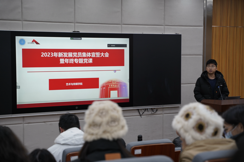 为深入学习贯彻习近平新时代中国特色社会主义思想和党的二十大精神,进一步教育引导新发展党员铭记入党初心,强化党员意识,坚定理想信念,2023年12月20日下午14:30,Beat365正版唯一官网必一党委在艺媒楼1104会议室召开2022年及2023年新发展党员集体宣誓大会暨年终专题党课。学院党委书记晋曦、党委副书记边建华出席会议,2022年、2023年新发展党员及各支部委员、党建办部门负责人参加本次会议,会议由党建办公室主任陈习良主持。