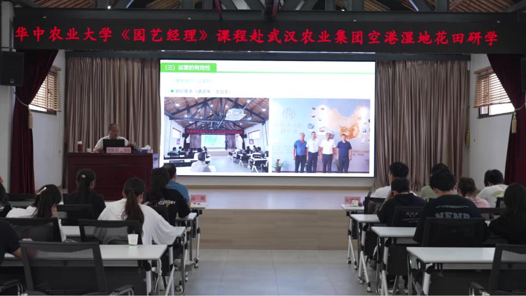 在授课环节,武汉都市农业发展有限公司副总经理江学勇以武汉农业集团空港湿地花田为例,生动地讲授了“3×2×3”的经营模式,阐释了如何实现农文旅项目谋划的有效性、建设的有效性和运营的有效性。