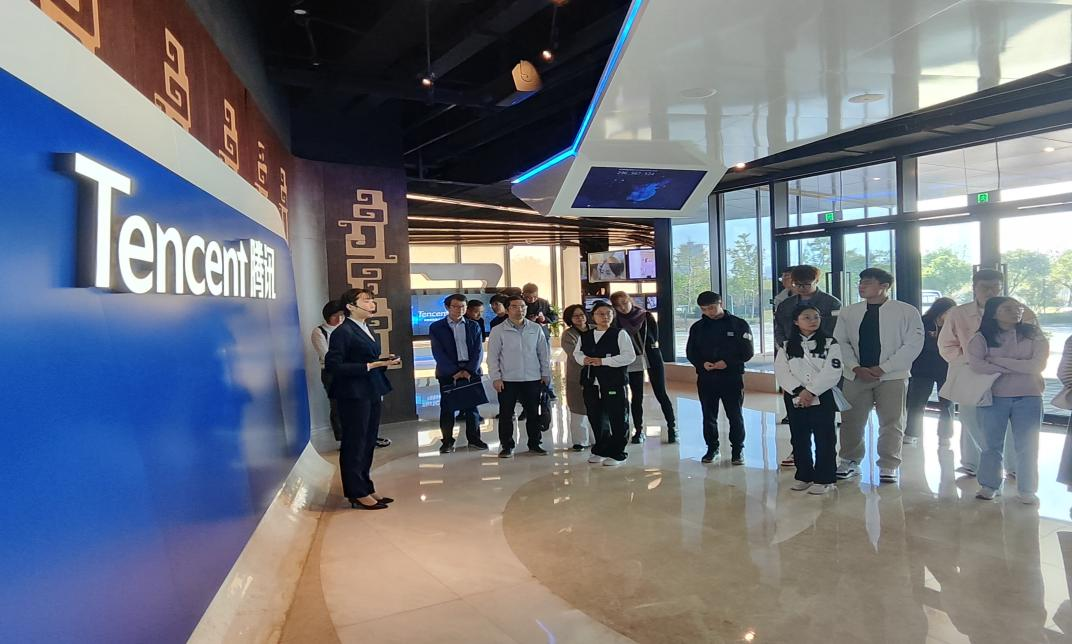 在武汉腾佳管理咨询有限公司人力资源总经理汪田引导下,师生共同参观了腾讯公司、武汉腾佳有限公司展览馆。汪经理以公司的发展历史为主线介绍了公司在数字技术、数字经济、城市大脑、元宇宙、公共社会服务等领域的最新成果。