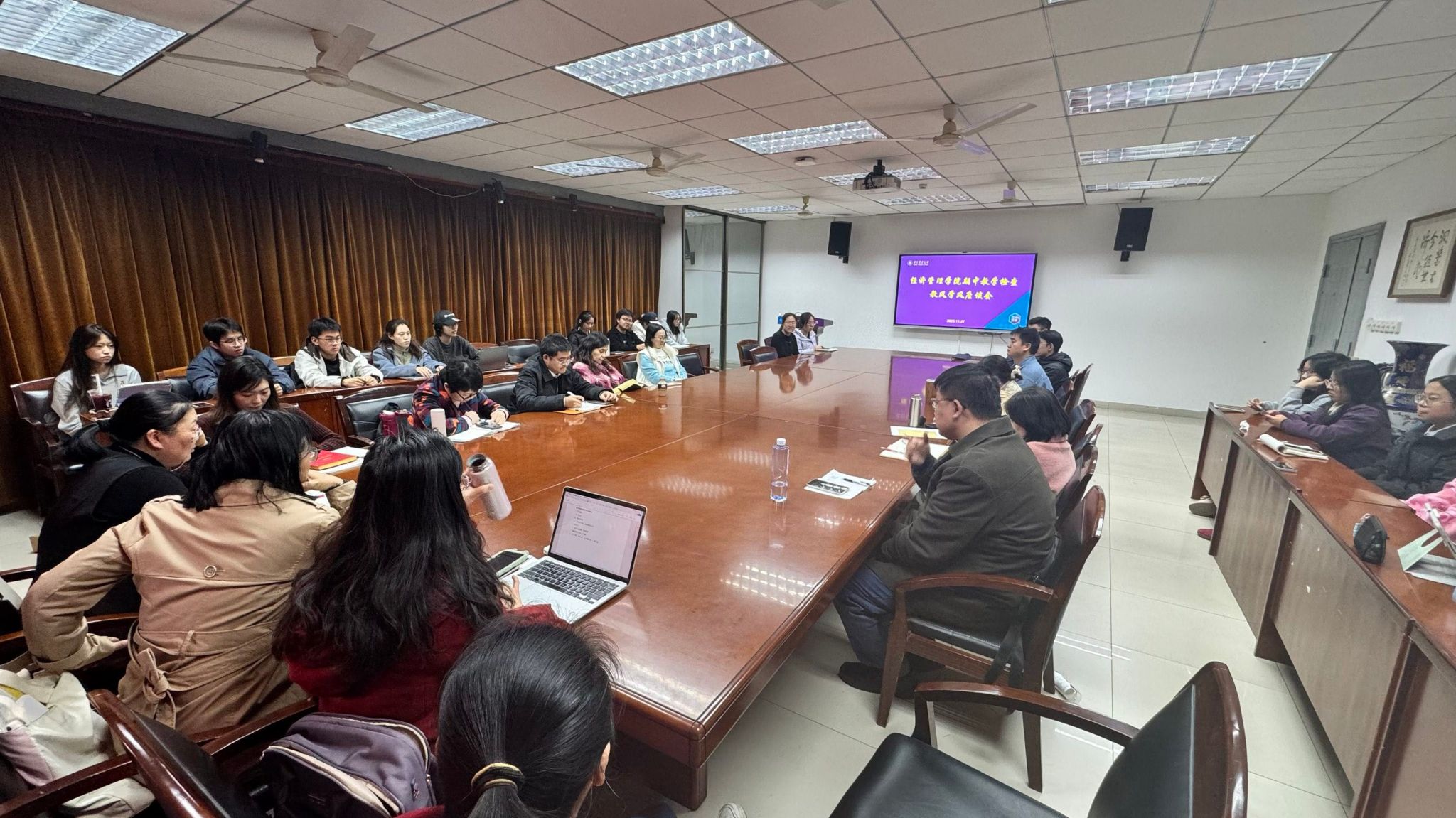 在企业管理系的座谈会上,学院党委副书记张进强调,要持续加强课堂管理、优化激励机制、严格落实院规校纪,构建师生协同、班委带动的学风建设长效机制。成协设处长建议,师生应共同规范人工智能使用,推进数字教育融合;通过优化课程梯度、融入学科前沿提升课堂吸引力;支持班委牵头成立学业帮扶小组,促进全体学生共同进步。