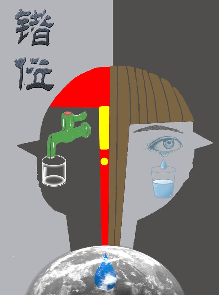 创意说明:作品的名字叫做“错位”:水本来应该从水龙头中流下,但当水资源匮乏时,水却只能来自人类自身的眼泪。该作品的意义在于通过形象直观的方式向人们呈现出地球可用水资源缺乏的现状,并通过生活中最常见的用水方式来提醒人们节水的重要性,让水资源永不“错位”。