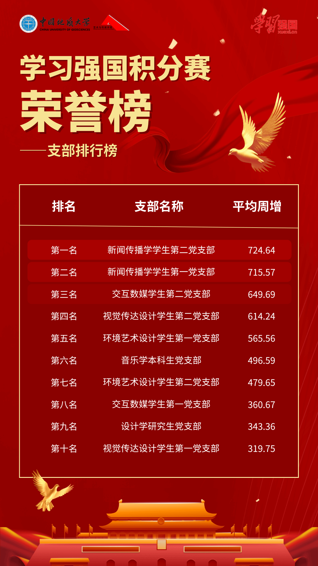经过28天的激烈角逐,活动评选出10名党员“学习积极之星”、10名入党积极分子“学习积极之星”及3个“学习积极党支部”。个人榜单上,新闻传播学学生第一党支部林志薇以1441分的总积分位列党员排行榜榜首;环境艺术设计学生第一党支部李斯颖以1453分的总积分位列入党积极分子排行榜榜首。支部榜单上,新闻传播学学生第二党支部以724.64的平均周增积分位列第一。