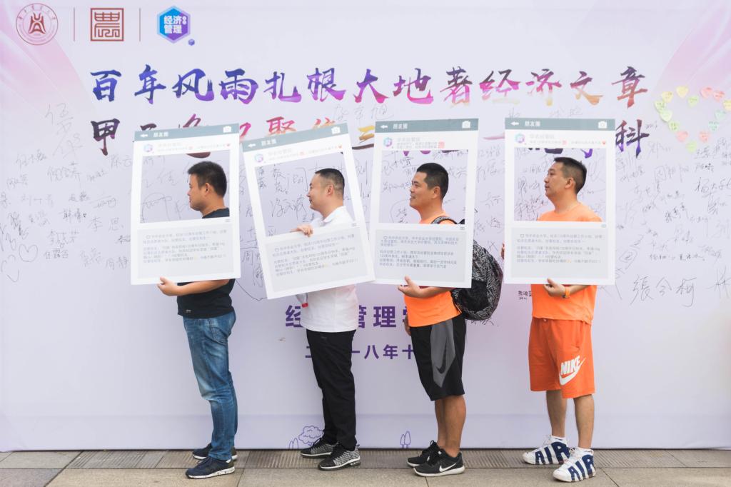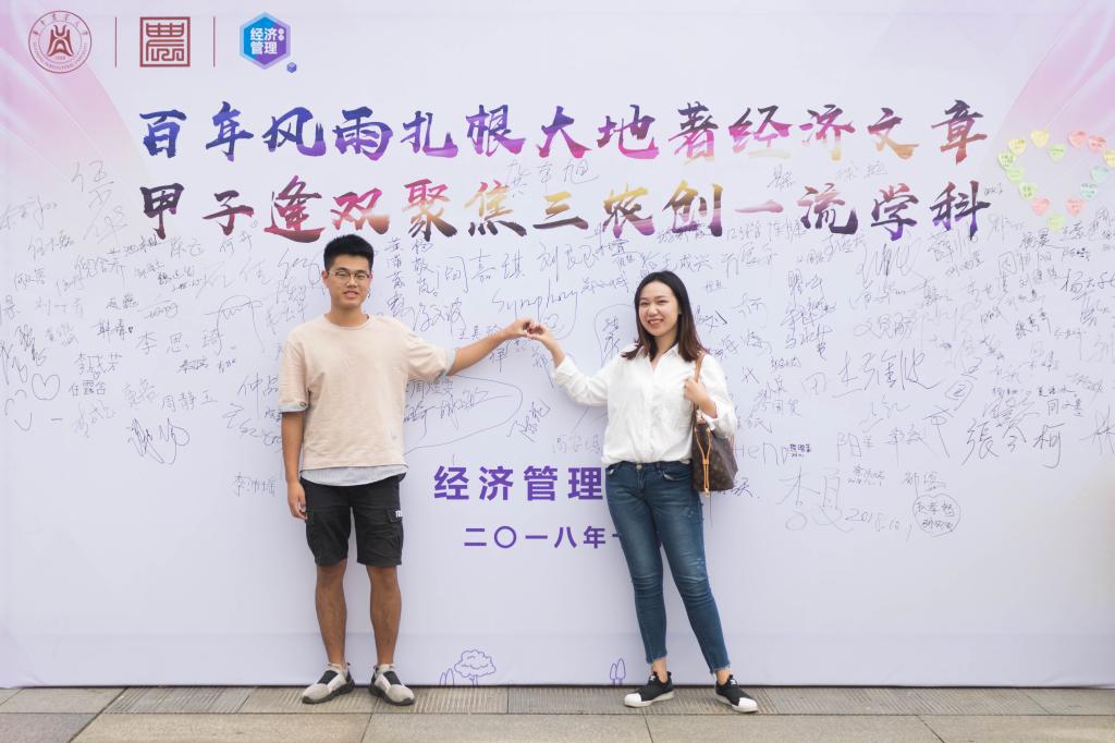 王国有也是农经系1964级校友,在女儿和女婿的陪同下乘坐动车来到华农。他讲道,华农变化很大,找不到接待点时心情很急躁,但在志愿者的引领下找到后心情逐渐平静下来。随着一声“123,茄子”,1964级校友在签名墙下合影留念,让相聚的这一刻成为永恒。