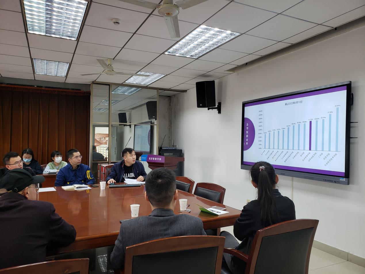 会上,陈尉介绍了2022届本科毕业生就业情况,分析了学院648位本科毕业生的就业状态及意向,通报了各班级的就业率及考研情况。