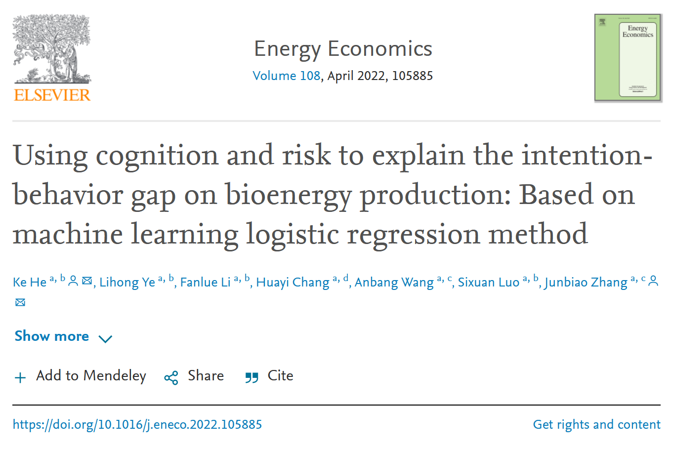南湖新闻网讯(通讯员 王瑜洁 叶丽红)近日,beat365官网农业资源与环境经济团队何可副教授主笔撰写的题为“Using cognition and risk to explain the intention-behavior gap on bioenergy production: Based on machine learning logistic regression method”的研究论文在能源与环境经济学国际知名期刊Energy Economics发表。