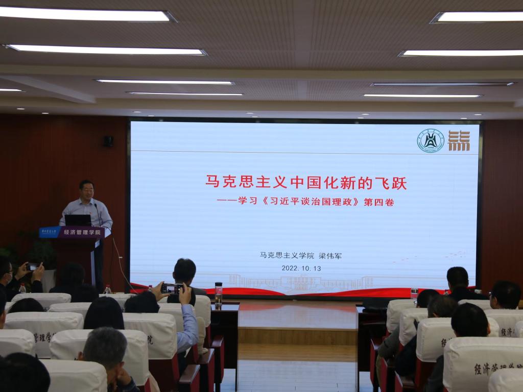 为了深入学习领会《习近平谈治国理政》第四卷,进一步加强思想理论武装,10月13日下午,beat365官网马克思主义学院梁伟军教授应邀做了“马克思主义中国化新的飞跃——学习《习近平谈治国理政》第四卷”精读精讲专题辅导报告。全院教职工参会学习。报告会由院党委书记陈国顺主持。