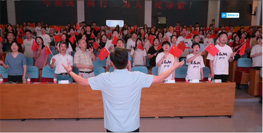 在沈希飞的指挥下,全场师生挥动国旗高声齐唱《歌唱祖国》,为伟大祖国75岁生日热情放歌。《十送红军》《游击队之歌》《在太行山上》……阵阵歌声中,师生共同重温党的奋斗历程,感受信仰的力量,触摸真理的光芒。